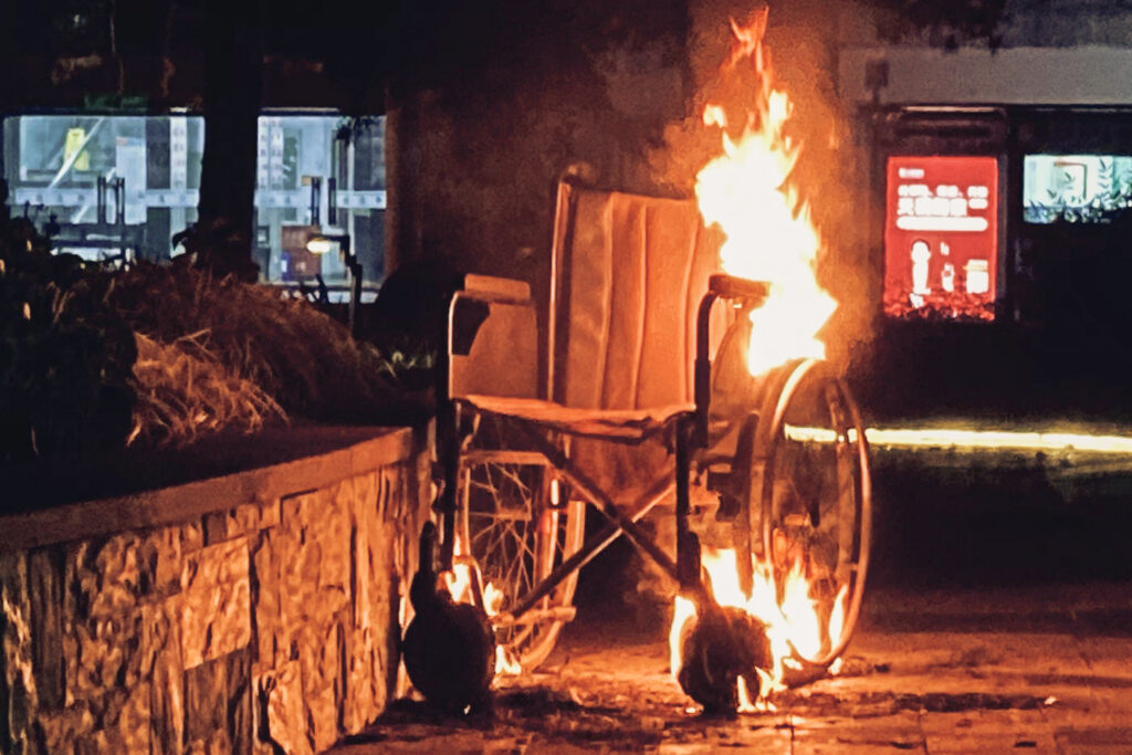 那火越烧越大,从轮子到靠背都冒出浓烟,金属爆裂的声音远比爆米花的声音更加令人舒畅。不久,那轮椅开始一点一点地融化,哐啷哐啷,是金属棍子掉到地上的声音。